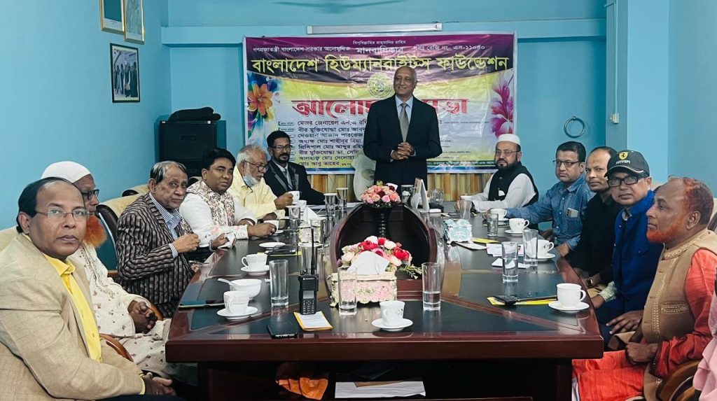 বাংলাদেশ হিউম্যান রাইটস ফাউন্ডেশন এর প্রধান কার্যালয়ে বক্তব্য রাখেন সভাপতি বীর মুক্তিযোদ্ধা মেজর জেনারেল এন এ রফিকুল হোসেন ( পিএসসি) অবঃ। এবং মানবিক ও মানবতার সৈনিক গন।
